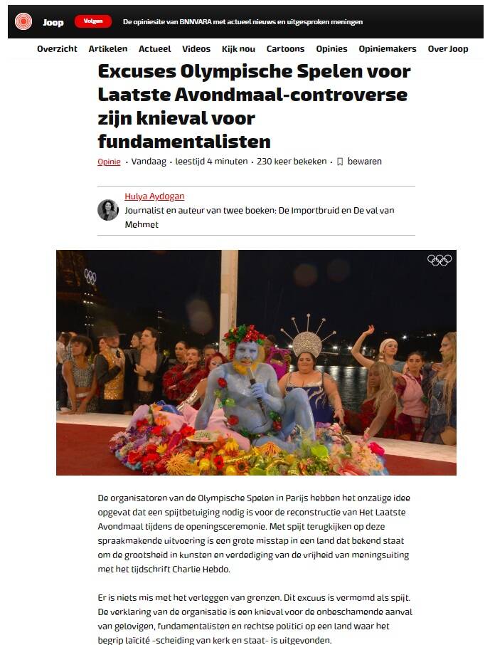 Met hun excuses supporten de organisatoren een aanslag op onze fundamentele rechten: de vrijheid van creatie, individualiteit, vrije partnerkeuze, zelfexpressie, politieke bewustwording en blasfemie. Deze spijtbetuiging is de gastvrijheid van Frankrijk onwaardig en moet gecorrigeerd worden. De organisatoren van de Olympische Spelen zijn geen knechten van religieuzen en populisten. Doe geen knieval in het huis van laïcité.