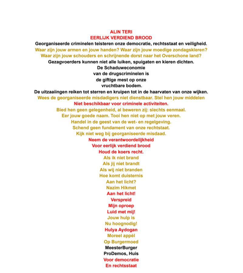 “Als ik niet brand. Als jij niet brandt. Als wij niet branden. Hoe komt duisternis aan het licht?”, dicht Nazim Hikmet.